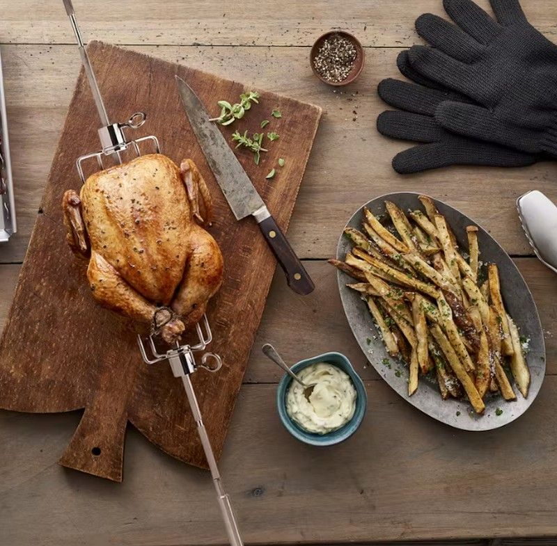 Dale la vuelta a la forma de cocinar y utiliza tu barbacoa para preparar costillas, pierna de cordero o pollo como un profesional. Solo necesitas el asador giratorio para barbacoas de gas Spirit y Spirit II 200/300 de Weber. Dispone de todos los accesorios que necesitas para asar sin límites: espetón de acero inoxidable, tenedores para sostener cortes de carne grandes o pequeños, mango y mucho más. Ponlo a funcionar y déjate envolver por el aroma de la barbacoa mientras te relajas al aire libre.