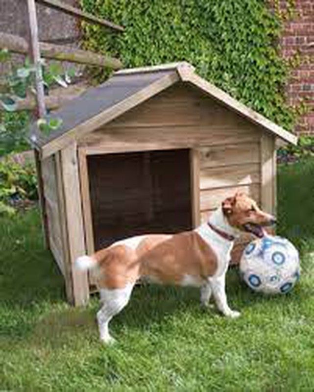 Caseta para perro fabricada de madera tratada con autoclave. Techo con fieltro asfáltico abatible en los dos lados.El suelo es elevado para evitar la humetad y como aislante térmico.