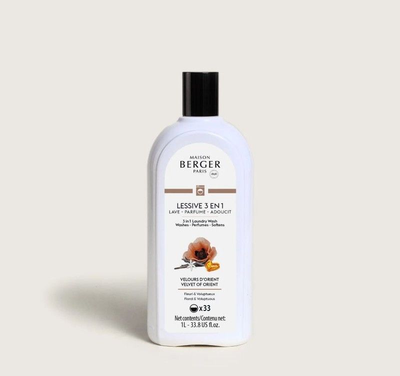 EL detergente Velours d'Orient, 3 en 1 de Maison Berger limpia eficazmente, suaviza y deja una fragancia embriagadora de larga duración en su colada. Es perfecto para el uso diario, sin colorantes y eficaz a partir de 30°C. La fragancia permanece impregnada en el tejido incluso después de varios días.