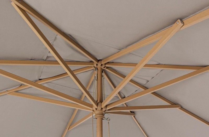 Sombrilla cuadrada modelo Eclipse de Bizzotto. Este modelo tiene las medidas de 3x4 metros de diámetro. Su estructura está fabricada con aluminio con barniz en efecto madera, con corona de plástico. Su tela está compuesta de poliéster (grosor: 235gr/m2) con chimenea cortaviento. Tanto la base como la tela las encontramos en color visón.