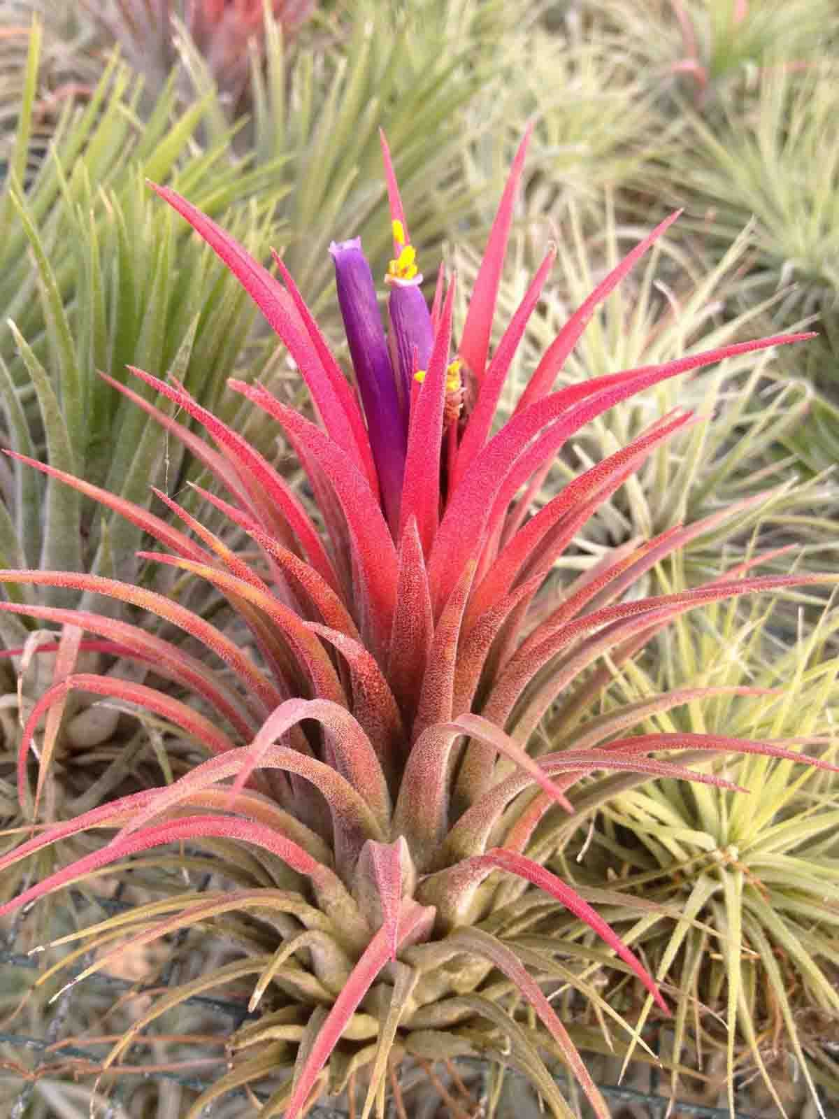 La Tillandsia ionantha var. ionantha es de base de color plata con flores violetas intenso. Durante la floración la planta se vuelve roja.